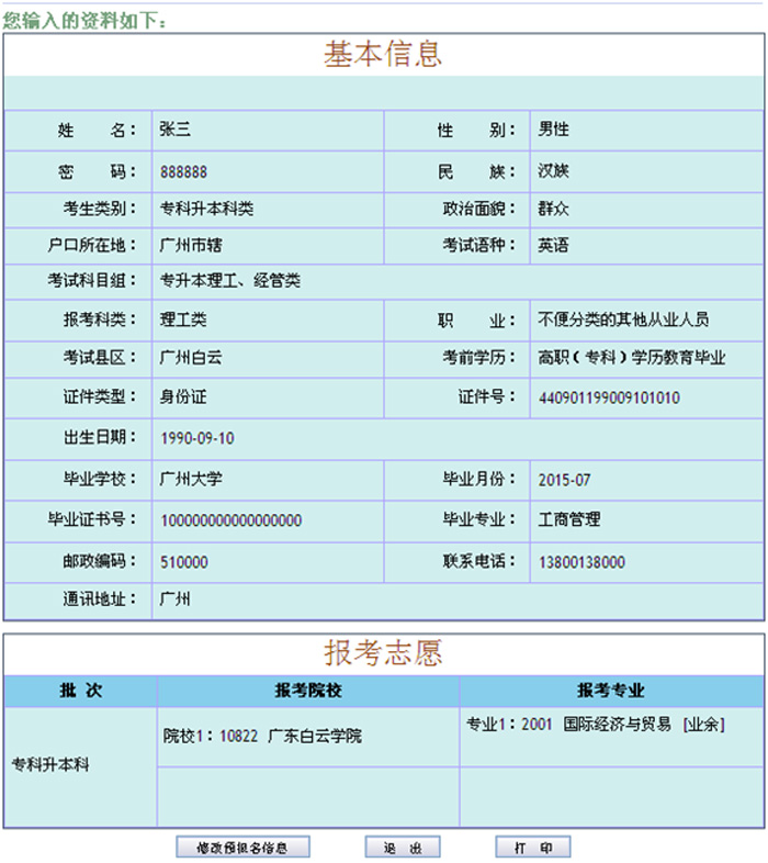 第四步:保存预报名信息。在确认以上信息准确无误后,点击“保存报名资料”,完成成人高考预报名。生成如下信息(表三)。