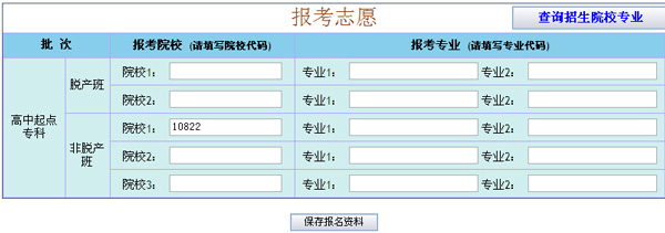 在对应的“非脱产班”的“院校1”填写10822(广东白云学院代码),在专业1填写所报考的专业代码(参照附件1,或点击“查询招生院校专业”查询)。